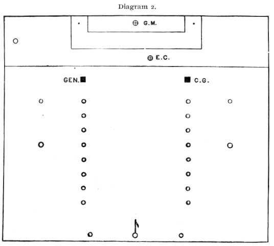 In the first diagram the Grand Master is seen moving towards the East under the Arch of Steel, the Generalissimo and Captain General one step in his rear, and the Eminent Commander awaiting his arrival on the lowest step of the Dais. The Prelate is in his station, standing, and the Senior Warden, the Junior Warden, the Treasurer and Recorder are saluting. The Standard is drooped, and the Senior Warden and the Warder are saluting.