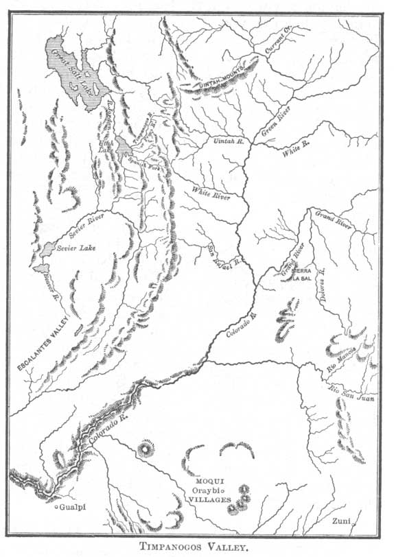 Not far from their path was a ranchería of Yutas, which the Spaniards visited, endeavoring to obtain guides to the land of the Timpanogos, Timpangotzis, or Lagunas, where they had been told to look for