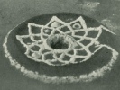 A lump of ground sage-seed and salt is made, arid with this the chief touches the girl's head, shoulders, arms, breast, knees, and feet, placing it at last in her mouth. He must do this facing the north and after walking three times around the sand-painting and making invocation to the north. She then kneels in front of the sand-painting, and with a hand on each side of it bends and spits the lump into the central hole, which is then covered by several men who sit around and push the sand with their hands from the circumference to the center, obliterating the painting and covering the hole at the same time.