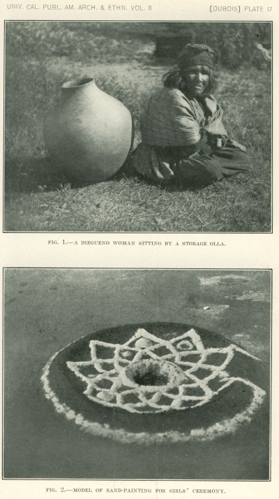 Plate 17 (referred to on page 88 as Pl. 2). Fig. 1.A Diegueño woman sitting by a storage olla. Fig. 2.Model of sand-painting for girls ceremony.