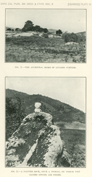 Plate 19 (referred to on pages 158, 159, as Pl. 4). Fig. 1.The ancestral home of Lucario Cuevish. Fig. 2.A painted rock, once a woman, on which two sacred stones are poised.