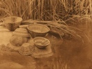 Flint Boy went away, went to the Sacramento valley, came to Sacramento river. He crossed with I'lhat?aina, and went on to the west. He came to the mountain at night, went up to the sweat-house, looked in, and saw the girl of whom he had dreamt. Many other people were there also. She sat on the east side. Flint Boy came in and sat down beside her. All looked at him, her father and mother looked, and said, "Who is that?" Flint Boy had left I'lhat?aina, outside, had tied him to the acorn sacks. Her father said, "Where did that man come from?" The girl said that she did not know. "It looks as if you were married," said her father, and he gave her a black-bear skin for Flint Boy to sit on.