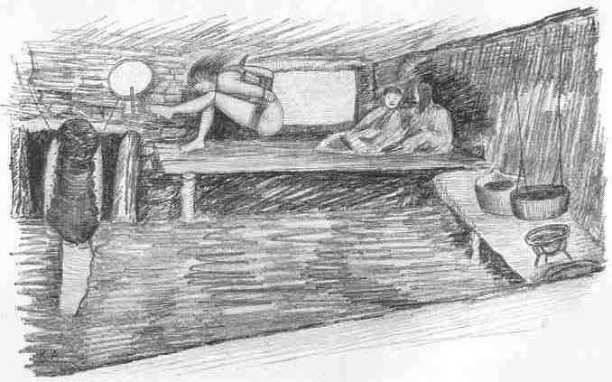 When the wizard was about to call upon his spirits, it was his custom to call in through the window: "Only the married men may come and hear." And when they who were to hear the spirit calling went out, a little widow and her daughter and Isigâligârssik always stayed behind together in the house. Once, when all had gone out to hear the wizard, as was their custom, these three were thus left alone together. Isigâligârssik sat by the little lamp on the side bench, at work.