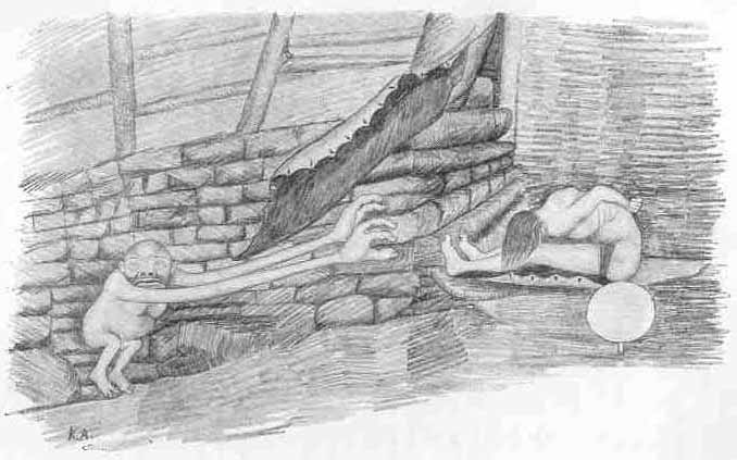 IT is said that Ángángŭjuk's father was very strong. They had no other neighbours, but lived there three of them all alone. One day when the mother was going to scrape meat from a skin, she let the child play at kayak outside in the passage, near the entrance. And now and again she called to him: "Ángángŭjuk!" And the child would answer from outside.