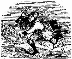 A NUMBER of people once lived together in a large house. Among them was a man named Ussungussak, who generally came home empty-handed, when all the others returned with what they had caught, for which his wife used to scold him. One night she had gone on rating him worse than usual, and in the morning he had disappeared. He kayaked along shore, and having rounded a point he saw a man standing on the beach. At first he was frightened; but then he thought a little, and finally concluded, "Why should I be afraid at the very moment I have resolved to go and lead a solitary life all by myself?" When the man on shore called him, he alternately approached and again turned back; but when he had come pretty close to the beach, the other threw out a trap, by which he drew him in, and ordered him to follow to the inland. They now wandered along together and came to the gulf of the earth. There, poor Ussungussak began to whine and p. 256 howl; but the inlander put a cord round his neck, straining it so hard that he was nearly choked; when he again untied him, however, they had safely passed the fearful precipice. Having next crossed a beautiful meadow, they gained the house of the inlander, who had a wife but no children. In the morning Ussungussak was ordered to remain at home, while the master of the house went away himself, and returned very noisily in the evening with what he had taken. In this way several days went by; but at length Ussungussak got desirous to see his own home, and the inlander accompanied him on the way. This time they did not see the precipice; but arriving at the coast they saw a great many killed seals on the beach, being those which the inlander, standing on shore, had caught in his trap. When Ussungussak was about to take leave, the inlander said, "Henceforth thou canst take some of these seals, but mind, thou art not to be too greedy: thou mayst take one at a time to begin with; afterwards thou mayst take two." Ussungussak then returned to his homestead and housemates, who were having good hunting at the time. The next day he again disappeared, but in the evening returned with two seals. The following day he brought home three; the others asked him whereabouts he had got them. He answered, "Out at the most seaward place;" and they demanded of him whether they might not accompany him thither. But when he had carried away the very last of the lot, he one night returned without anything at all, and was again scolded by his wife. The day after he left as before, and kayaking along shore he at length turned a point, and again beheld the inlander. This time he willingly approached him when he was called, and went along with him; but when they had gained the precipice, he did not get over this time, but was fairly strangled. When Ussungussak's relations and housemates had been expecting him in vain for five days, one p. 257 of the kayakers went out in search of him. He encountered the inlander, and asked him whether he had not see a man. "To be sure I have, and I killed him myself!" At this the other thrust his harpoon at him, and he ran on with the hunting-bladder dragging behind him, and thus disappeared. The coastman now took his spear and bladder-arrow, following him swiftly,