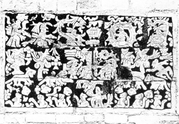 a and b, Puma and squirrel from the frieze of the Temple of the Warriors at Chichen Itzá. c, The four trees and birds set at the cardinal points to commemorate the previous destruction of the world. Sculptured panel of the Temple of the Wall Panels at Chichen Itzá. (After Ruppert.)