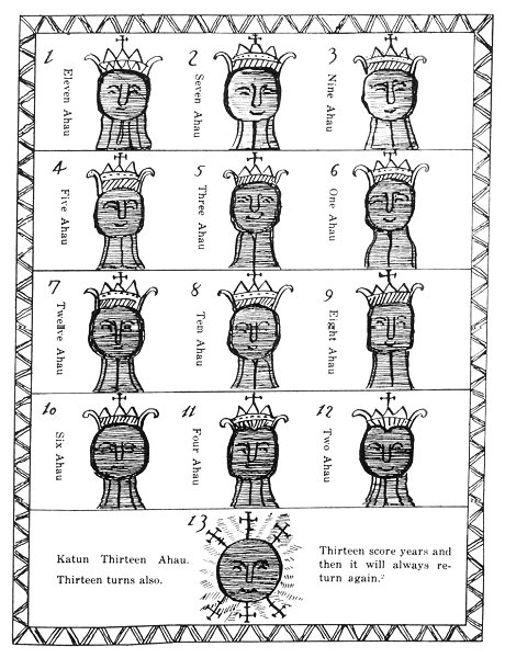 FIG. 29--The lords of the thirteen katuns. (Chumayel MS.). / [p. 84 C] We have here a picture of the thirteen Lords of the Katuns. The blurred faces may signify that they are blindfolded. The crowns, crosses and manner of drawing are purely European, but they doubtless represent the idols set up in honor of each katun. Unfortunately no pre-Conquest representation of these figures has come down to us. Cf. Landa 1929, PP. 94-Too, also Appendix D. After thirteen Katuns the same series will always recur . |