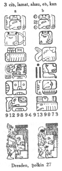 56:* The text figures are from the Dresden codex, and probably show the goddess Ixchel, in the first as goddess of childbirth, or Lucina; in the second she bears the signs of 'new day,' spring, renewal time. The wife of Itzamná, in the Maya pantheon she corresponded to Isis.