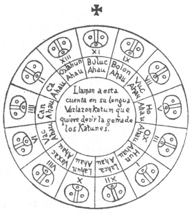 Not only did the Indians have a count for the year and months, as has been before set out, but they also had a certain method of counting time and their matters by ages, which they counted by 20-year periods, counting thirteen twenties, with one of the twenty signs in their months, which they call Ahau, not in order, but going backwards as appears in the following circular design. In their language they