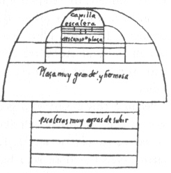 This structure has four stairways looking to the four directions of the world, and 33 feet wide, with 91 steps to each that are killing to climb. The steps have the same rise and width as we give to ours. Each stairway has two low ramps level with the steps, two feet broad and of fine stonework, like all the rest of the structure. The structure is without corners, because starting from the base it narrows in, as shown, away from the ramps of the stairs, with round blocks rising by stages in a very graceful manner.