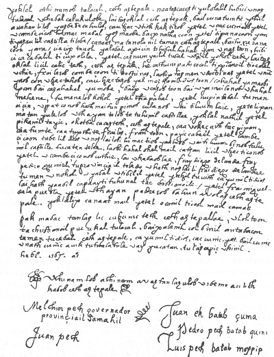 An exact duplicate of the above, in wording and handwriting, and accompanied by a Spanish translation, both the Maya and Spanish versions signed as by eight caciques of Calkini, Numkiní and other towns, the signatures being all in the same writing as the body of the letter, was published, with facsimile of the Maya version, in the great Cartas de Indias, in 1877.