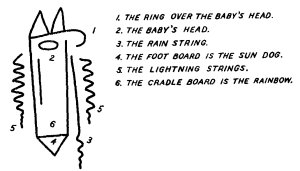 There is a notched stick running across, with a notch holding every other thread. The Spider Man said: "It will be called yote biltz nes thon, looping with the beautiful goods." His wife said: "From henceforth it shall be called nil tliz biltz nes thon, looping with mixed chips." Then they used a narrow stick about two and a half feet long, and they wound the yarn or thread over it, and where there is no design they ran it along. That was given the same name as the ball of thread. The Spider Man held that it should have the same name as the ball; but his wife said: "No, it shall be called nil tliz nasmas agha."[95]