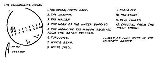 There were at that time different places where the water was sacred; but there were other places where people drowned, where people were killed by lightning, while others sank in quicksand or marshes. This is what the Elder Brother was thinking about when he spoke. He went to the Black Yei, who is called Hasjejine, and told him of his plan. Then he traveled to the home of the Water Buffalo.