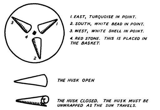 The rattle must be held in the right hand [Hasjelti said]. It represents the Black Water Jar, and the feathers on the right side of the headdress also represent the Water Jar. The feathers on the left stand for the ears of corn. They represent the ears of corn when held in the hand, just as the Corn Father stands.