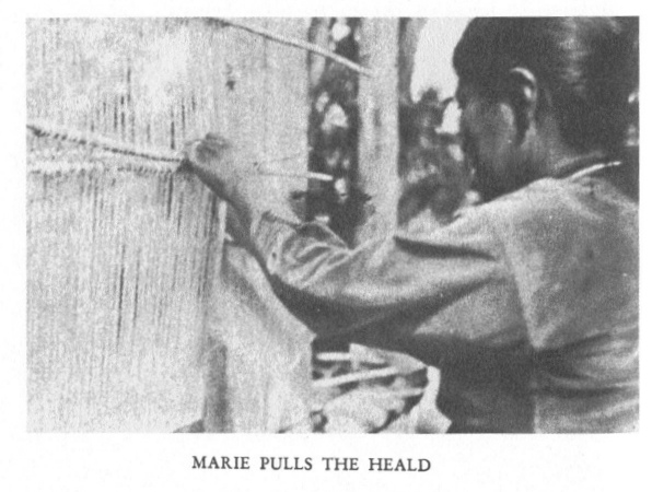 We stop weaving for several days because there is no more white or gray yarn. Marie and I take time to card, my contribution not adding much to the accumulating pile of fluffiness. The position necessary for carding has my hands cramped in less time than it takes to card a single portion. The next day, however, I can keep at it half an hour. Ninaba and Maria Antonia take their turns with the extra pair of towcards when they come in to visit. I try spinning too when Marie takes to it. It is not a difficult operation although it is not easy to obtain creditable results. Spinning, like bicycle riding, is an art which cannot be taught. It can be "shown"; after that only practise will bring forth a satisfactory result.