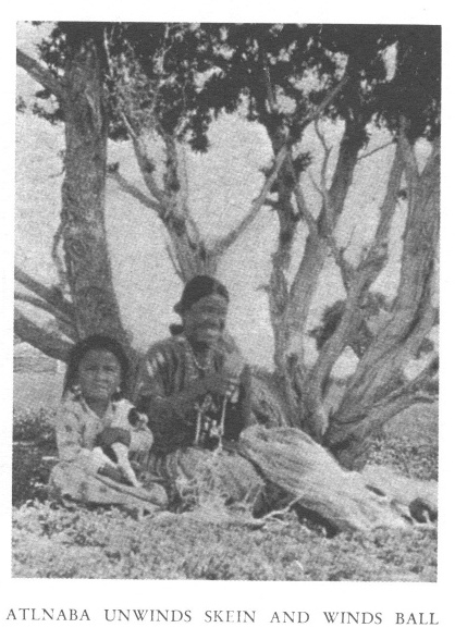 I have waited two days for white and gray yarn. They have not been wasted. I have been "seeing Navajo life," learning Navajo words. I have been to Ganado for towcards and dyes and have taken the teasing my white friends, the traders, consider necessary each time I report to them. I do not weave on the morrow either. Atlnaba finishes her tapestry. I photograph it. I take her, the rug neatly wrapped in unbleached muslin, and such of the family as the Ford will hold to Ganado; Atlnaba and Curley's-Son, Marie, Tom and their two little boys make up what I innocently regard as a capacity load for a small, a very small, touring car.