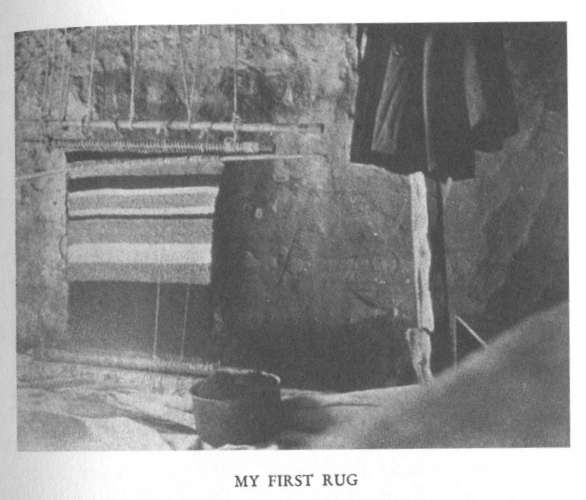 Marie weaves a great deal on this blanket. Eagerly watching, I feel as she felt when as a little girl she eyed her mother and tried to learn what made the design. She, however, unlike her mother, is not unwilling to help me all she can. She "shows" me patiently each time I need to advance or to withdraw. The only thing she does not allow me is to make mistakes alone. Take them out also if need be, but get understanding I must. However, I finish this day with a feeling of absolute futility. Am I so dull that I cannot grasp this apparently simple point?