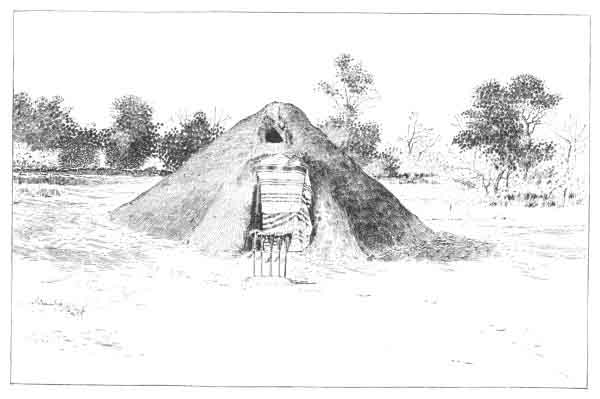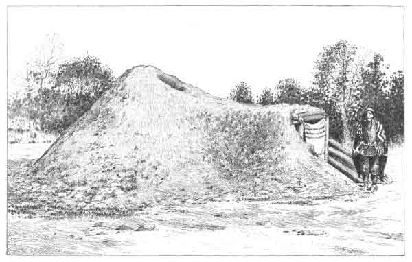 83. This lodge was a simple conical structure of large, partly hewed piñon logs, set on end and inclined at an angle of about forty-five degrees, so as to join one another on top, where they formed the apex of the lodge. The circle of logs was incomplete in the east, where the openings for the door and the smoke hole were. A passage, or entry, about live feet high and three feet wide, led from the body of the lodge to the outer doorway, where some blankets hung as portières. The frame of logs was covered with sods and loose earth to keep out wind and rain. Internally, the lodge was eight feet in height under the apex of the cone and on an average twenty-five feet in diameter at the base. The diameter was increased at the east (to allow for the entry) and at the north. The irregularity in the circumference in the north was at first conjectured to be a mere accident; but in the ceremonies of the first night its use became apparent as affording a hiding place for the man dressed in evergreens. (Paragraph 96.)