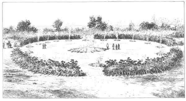 about forty paces in diameter, and the fence was about eight feet high, with an opening left in the east about ten feet wide.