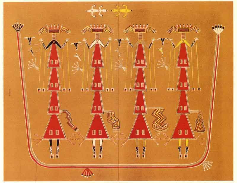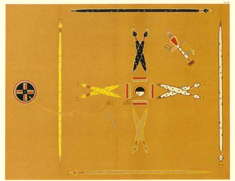 154. A description of the four great pictures drawn in these ceremonies has been deferred until all might be described together. Their relations to one another rendered this the most desirable course to pursue. The preparation of the ground and of the colors, the application of the sacred pollen, and some other matters have been already considered.