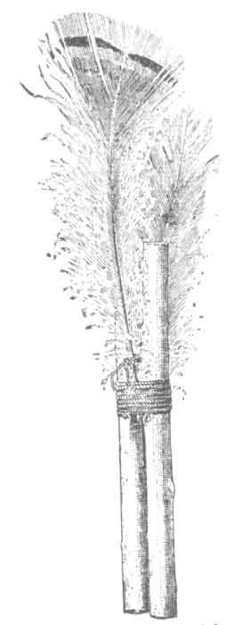 179. In Schoolcraft's Archives of Aboriginal Knowledge, Philadelphia, 1860, Vol. III, page 306, is a cut illustrating an article undoubtedly of a similar nature to that shown in Fig. 59. It is a sacrificial plume stick of the Moki. The Moki interpreter explained to Mr. Schoolcraft that it contained a message from the Indians to the President and the particulars of this message are fully set forth in his text. At first I doubted if the object could have any other purpose than a sacrificial one and was inclined to discredit the statement of the Moki interpreter. But on learning that the Navajo had a similar arrangement of sticks and feathers, which was called by the significant name of keçàn-yalçi`, or talking kethàwn, I was more inclined to believe that some of these kethàwns may answer a double purpose and be used to convey messages, or at least serve as mnemonic aids to envoys.
