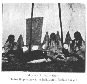 their wives held up their hands with the two index fingers curved towards each other (the others closed) in imitation of buffalo horns, the sign of the buffalo. The hides were spread on the ground in front of the priests during the chant: