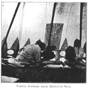 While the rest were feasting, I saw Awunna, a kindhearted old priest and doctor, gathering together a supply of food. Before tasting anything himself, he carried it to his wife, E-kit-o-waki, one of the old women who had been dancing outside the lodge. They were an interesting couple. He always seemed thoughtful of others and in a good humour, while E-kit-o-waki, his wife, was still full of fun and life. Before the ceremonial began I saw Awunna draw her to one side and gently placing his hands upon her, uttered a prayer giving her his blessing. This was because she was about to enter Bear Child's lodge to doctor a sick child.