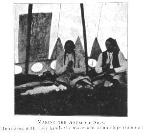 For the Antelope song Mad Wolf, O-mis-tai-po-kah and their wives chanted while making the antelope sign. Holding their hands closed, one above the other, they changed positions alternately with a quick graceful movement, in imitation of antelope running.