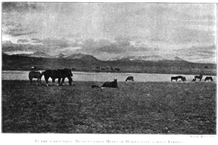 WHEN the sun was setting, I walked through the camps of the Lone Eaters and Don't Laugh bands along the shore of the lake. The picturesque lodges, with their painted decorations and blue smoke rising from their tops, were perfectly reflected on the surface of the quiet lake. I crossed a rich meadow, very beautiful in the soft evening light, with its long waving grass and brilliant wild flowers, and climbed to the summit of a neighbouring butte, where I had an excellent view of the entire encampment. On all sides larks, thrushes, and Savannah sparrows were singing. In the surrounding meadows, large herds of horses were quietly feeding, while upon the summit of a ridge was a solitary horseman, who had left the noisy camp for quiet and meditation. He stood gazing out over the vast expanse of country towards the mountains. The sun, sinking behind the Rockies, lighted up the sombre cloud masses with a splendid colouring, while its pencilled rays, streaming to