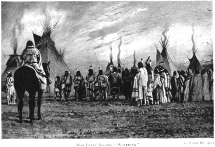 Beside O-mis-tai-po-kah's tipi, a band of young men were singing a Wolf 1 song together, reviving the custom of former days, when an expedition was starting upon the war path. They stood in a circle, holding a raw hide between them, upon which they beat time with sticks. They sang no words, but gave the wolf howl at regular intervals, the young women, who stood near, joining in the wolf howl. They said this song was very ancient, having been handed down through many generations. It was sung in time of danger when hunting, or upon the war path, in the belief that the wolf would inspire the singer with his cunning.