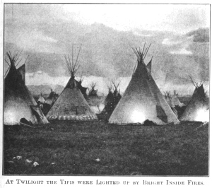 AT TWILIGHT THE TIPIS WERE LIGHTED UP BY BRIGHT INSIDE FIRES.