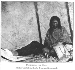 Stuyimi's shirt and blanket being removed, he lay upon the bed stripped to the waist. Awunna then signed to his wife to begin. She took some herbs from her medicine sack and threw them into a pot, which she placed on the fire to brew into a hot drink. Removing a coal from the fire, she placed dried sweet pine upon it, and holding her hands in the smoke, prayed to the Spirit of the buffalo that she might be endowed with power to discover the place where the disease lay. Kneeling by his side, she placed her hands upon his body, feeling gently with the tips of her fingers until she announced that the trouble lay in the breast and was worse on the left side. She took a hot stone from the fire and placed it in a kettle of water. As the steam arose, she dropped roots into it, one by one, and prayed: