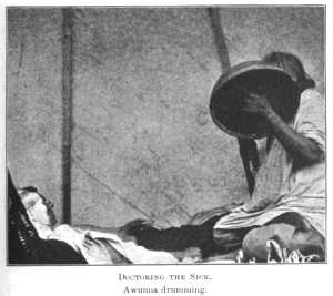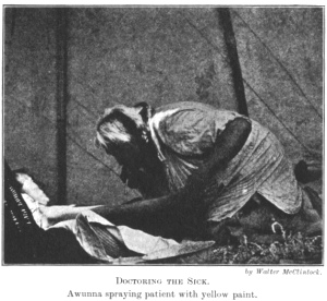 retired, Awunna knelt beside the patient, beating rhythmically upon his medicine drum, while I united with him in his chant, praying for power from the eagle. Taking yellow paint from a small sack, he sprayed it through his medicine whistle over Stuyimi's breast, arms and back. Grasping a large eagle wing, he imitated the motions of an eagle flying, and beat the