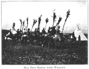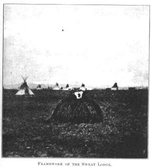 TEN of the Mad Dogs rode to the river to cut one hundred long willow branches for the large sweat lodge. On their return, they entered from the side that faced the setting sun. Forming in line, they marched slowly round the camp circle, holding the green branches high in the air, and singing their society song in unison. When they returned to the place where they had entered, they built the framework of the lodge there, by firmly setting the willow branches in the ground, and bending them into the form of an ellipse, about four feet high, facing the entrance toward the rising sun. The north side was painted red and the south black. When the sweat lodge was finished, other Mad Dogs were called upon to gather one hundred stones of the size of a man's hand. If a stone were to fall, it foreboded misfortune, and if, during the day the men building the lodge either drank, or washed, it was believed to bring rain, which would interfere with the ceremonies. A fire was built for heating the stones.
