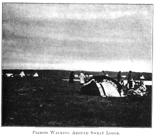 [paragraph continues] A sweat lodge had been built in each of the four camps, made previous to the large encampment, in which the Sun-lodge was constructed. In the first camp, it was built on the east side; in the second, south; in the third, west and in the fourth, on the north side, following the course of the sun through the sky in summer.