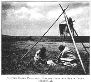 [paragraph continues] Spotted Eagle stuffed the grass into the nose and ears of the buffalo skull and tied it around the horns, symbolising the feeding of the buffalo. The Soyotoiyis (Carex Nebraskensis praevia) was the favourite food of the buffalo. Those inside the sweat lodge waited until they saw smoke rising from the sweet grass burning