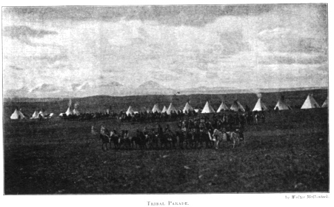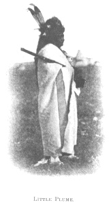 customary for the tribe, both men and women, to dress in their finest clothes and to paint and decorate their horses with feathers for a parade through the camp. On this occasion the women, who were to take part in the Scalp-dance that followed the parade, were permitted to wear their husbands’ eagle feathers in their hair. There were many elaborate and handsome costumes. Little Plume, a leading chief, wore a