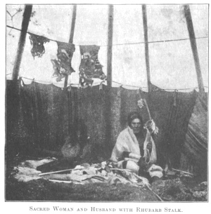 placed around the lodge on the outside, as the sign that only those bidden should enter. I stood near the door listening to a weird chant led by Mad Wolf. At intervals the low monotone of the priests was joined by the shriller voices of the women. Gradually the chant died away and there was silence, finally broken by Mad Wolf's voice directing that the fire be replenished. When a brighter flame lighted up the lodge, I decided that this was the opportune moment for entering, and so opened the door. In the uncertain firelight I was not recognised and two priests motioned me away. When I gave my Indian name, they bade me enter. On Mad Wolf's left were O-mis-tai-po-kah, Natosin, the chief from the north, and the Sun-dance priests; on his right, Gives-to-the-Sun, the sacred woman, Natokema and their assistants. All the women wore gray blankets coloured with dull red paint. Apisaki, daughter of Natosin, alone wore a blanket of brilliant colours. She was unmarried and had accompanied her father, that she might witness the medicine-lodge and become familiar with its ceremonials. Over the head of Mad Wolf hung the Medicine Pipe, and near by were the sacred bundles of the Beaver Medicine and Medicine Bonnet, the latter to be worn by Gives-to-the-Sun, during the ceremonial of "Raising the Pole," on the following day. In front of Mad Wolf was an altar, or holy place, made by cutting out the grass and smoothing the soft earth. It was lined with juniper (red cedar). At the foot, and bending towards the west, was a single stalk of wild rhubarb (cow parsnip), with an eagle plume fastened to the top. The wild rhubarb and plume were used by the Indians in the Sun-dance ceremonial as symbols of lightness, and were believed to favour the safe raising