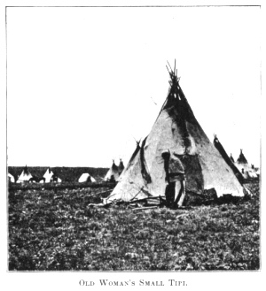 It was considered a practical joke for young men to lasso and overturn the tipis of old women at night, especially those of elderly single women, who lived alone near their relatives. One of them passing on horseback, would skilfully throw his lariat over the tops of the poles and, with the other end securely