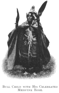 Bull Child wore a robe, 1 famous among the Blackfeet, and purchased by him from "Brings-down-the-Sun," a celebrated medicine man of the north. Many bird and animal tails were attached, including those of the eagle, owl, weasel, mink and gopher. It had also a small bell, two shields and several pieces of fragrant punk from the cottonwood tree. There were paint marks on the back of the robe to represent stars. One group of seven, across the shoulders, to represent the