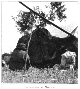country beyond, the clouds disappeared and the hot sun again shone in a clear sky. My thermometer registered 98 degrees in the shade and 130 degrees in the sun. We rested our horses at midday near a small lake. The women erected a shelter from the sun by throwing canvas over a wagon pole, supported on a tripod. The sides were then raised, allowing the breeze to blow through.