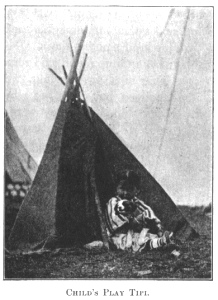 In an open glade was a miniature encampment, where a group of little girls were playing. They had men and women-dolls dressed in buck-skin, and cloth costumes, with real human hair and leggings and beaded belts and moccasins. There were gopher skins for robes, little knife-sheaths, tanning-tools and baby-cases. In the centre of the camp circle of miniature tipis, they had the largest tipi with long poles, for the head chief, also small lodge backs, painted parfleches and a diminutive medicine case, hanging from a tripod.