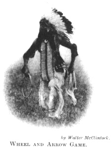 There was also the "wheel and arrow," a gambling game played by men with arrows and a small wheel with beaded spokes. The wheel was rolled over a smooth and level course, each player throwing an arrow at it. The points were counted according to the position of the arrows when the wheel stopped. Its origin is very