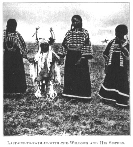 Running Fisher and his wife (Lone-Charge-Woman) became discouraged because of the death of all their children, although they had carefully complied with the customary precautions and observances, to insure their living to old age. When another child, a girl, was born, they decided upon a different method. They named her Sis-toi-tsi-ma (Something-that-is-given-away). They allowed her to run wild, hoping by that method to escape the bad luck that had befallen their other children. She is alive to-day and the mother of a family.