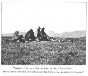[paragraph continues] Buffalo range, and frequent contact with other tribes, had constant use for sign language and were very proficient. I attended one of their large camps where representatives from 16 different tribes were present. Although unable to understand each other's spoken language, they talked freely and rapidly together in gesture speech. Each evening the visiting Indians withdrew to a ridge, overlooking the big camp, where I