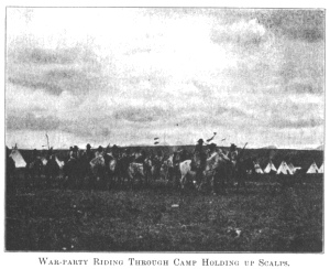 WAR-PARTY RIDING THROUGH CAMP HOLDING UP SCALPS.