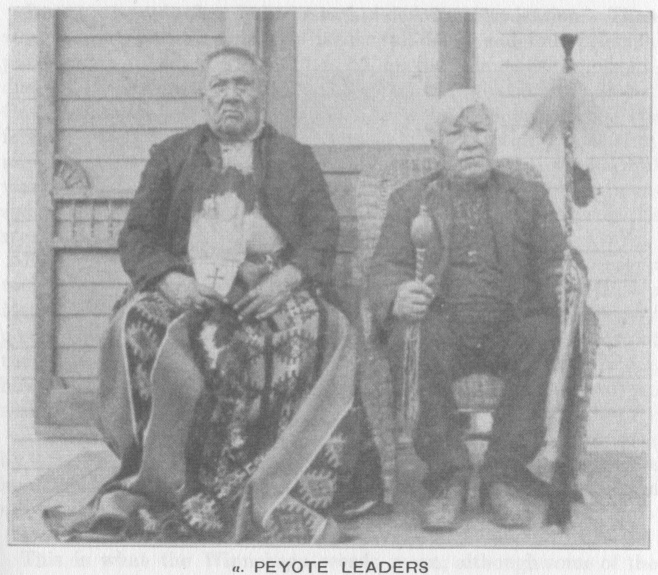 In 1910 the cult already had a rather definite organization. There was, at every performance, one leader (pl. 54, a) and four principal participants. John Rave (pls. 5, b; 55, b), the Winnebago who introduced the peyote, was always the leader whenever he was present. On other occasions leadership devolved upon some older member. The four other principal participants changed from meeting to meeting, although there was a tendency to ask certain individuals whenever it was possible. The ritualistic unit, in short, is a very definite one, consisting of a number of speeches and songs and in the passing of the regalia from one to the other of the four participants.