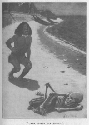After a little Bluejay went out and walked through the village, and began to open the doors of the houses and to look into them; and when he looked into them he did not find people in any of the houses, but only bones. Then he came back to where his elder sister was. On the bed near where his sister was sitting lay a skull and some bones. He asked her, "What are you going to do with that skull and those bones?" She said to him, "That is my husband, your brother-in-law." Bluejay did not believe her; he said to himself: "Ioí is telling lies. She says a skull and bones is my brother-in-law!"