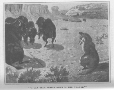 At length two of the young Bulls had a very fierce dispute, and almost came to fighting over it. The Coyote came up and looked, and said: "This is very close. I must look carefully, but I cannot see well if you are all crowding around me in this way. I must have room. You would all better go over to that hill, and sit down there and wait for me to decide." The Bulls all went over to the hill and sat down, and then the Coyote began to look. First he would go to one stick and look carefully, and then he would go to the other and look. The sticks were about the same distance from