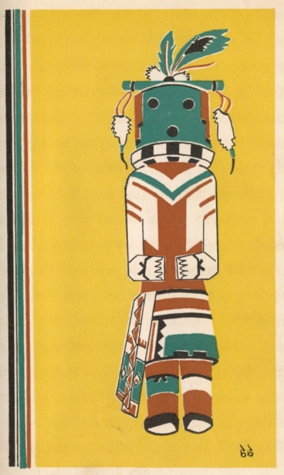 Among the Indians who listened to the medicine man was a little girl. She was holding in her thin arms a wonderful kachina doll made for her by her grandmother. This kachina was far prettier than any of the others in the tribe. It was made of wood carved with a flint knife. Painted on the wooden form were the clothes of a warrior, an Indian brave. On its head was a war bonnet of blue feathers and its eyes were made of two little black beads dyed from berries. The little Indian maiden loved her kachina, carried it with her when she played and slept with it in her arms at night.